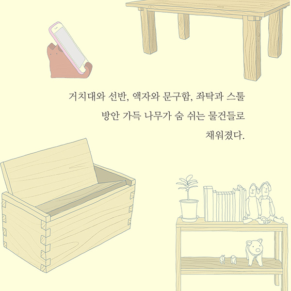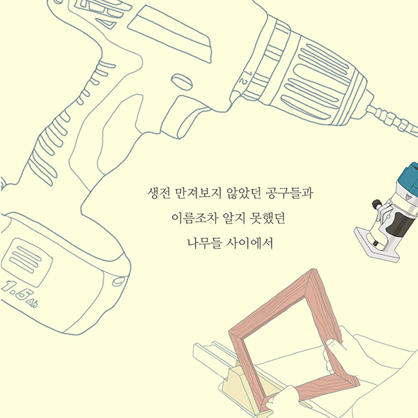 상자에서 간이책상, 탁자, 서랍, 스툴, 액자 등 딸에게 필요한 물건을 만들면서 체험한 목공체험 노트이지만 매뉴얼 북은 아니다. 나무로 물건을 만드는 일은 몇 장의 사진과 설명으로 쉽게 따라하거나 이해될 수 없다는 생각 때문이다. 대신 어떤 방식으로 진행하는 가에 대한 경험담과 도전에 대한 권유를 만날 수 있다. 나무를 켜고 자르고, 문지르고 이어가는 경험을 통해 사람의 집에서 함께 다시 살아가는 나무의 삶에 대한 이야기도 만날 수 있다. 나뭇결이 알려주는 것과 그렇지 않은 것, 나무의 이름에 대한 사람들의 오해, 눈에 보이지 않는 나무의 속살이 우리의 삶과 어떻게 닮아 있는지 무심코 지나칠 수 있는 지식들을 공유한다.