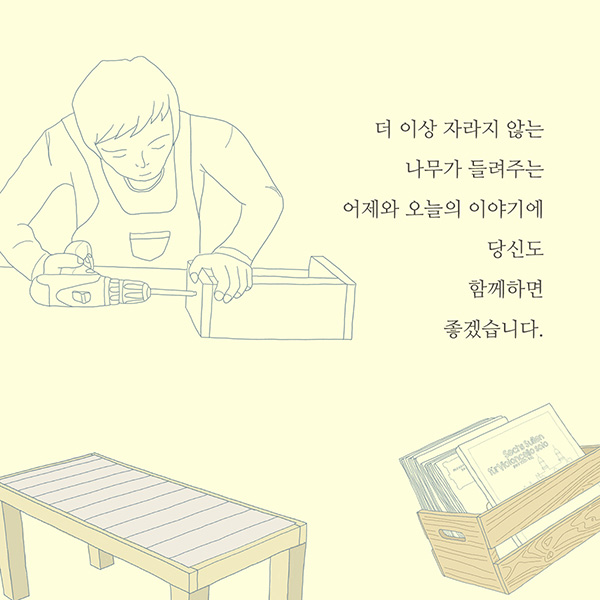 나무는 아름답게 하늘을 향해 솟구치며 첫 번째 삶을 산다. 그러다 베어지고 나면 집을 짓거나 가구를 만드는 일, 혹은 종이나 자잘한 물건들로 변하여 또 다른 역할을 감당하며 두 번째 삶을 산다. 크게 자라는 것만을 나무의 전부로 알았다면 나무의 반쪽만 본 것이다. 나무는 더 이상 자라지 않는 목재, 혹은 다른 이름이 되어 부여된 삶을 다시 살아간다.